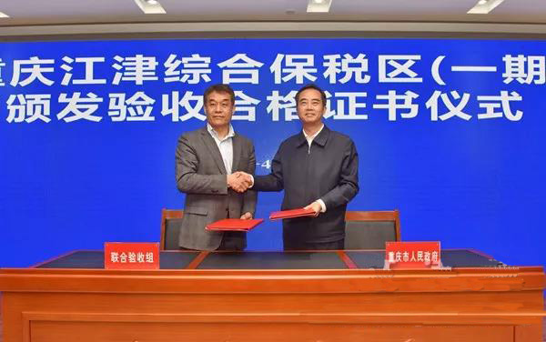 經(jīng)過認(rèn)真評審后,聯(lián)合驗(yàn)收組認(rèn)為:重慶江津綜合保稅區(qū)(一期)已圍網(wǎng)的1.28平方公里范圍內(nèi)的基礎(chǔ)和監(jiān)管設(shè)施符合《海關(guān)特殊監(jiān)管區(qū)域基礎(chǔ)和監(jiān)管設(shè)施驗(yàn)收標(biāo)準(zhǔn)》和國家有關(guān)法律法規(guī)的規(guī)定和要求,已具備封關(guān)運(yùn)行條件,同意通過驗(yàn)收。聯(lián)合驗(yàn)收組與重慶市人民政府簽署了《重慶江津綜合保稅區(qū)(一期)驗(yàn)收紀(jì)要》,并為江津綜保區(qū)頒發(fā)了(一期)驗(yàn)收合格證書。